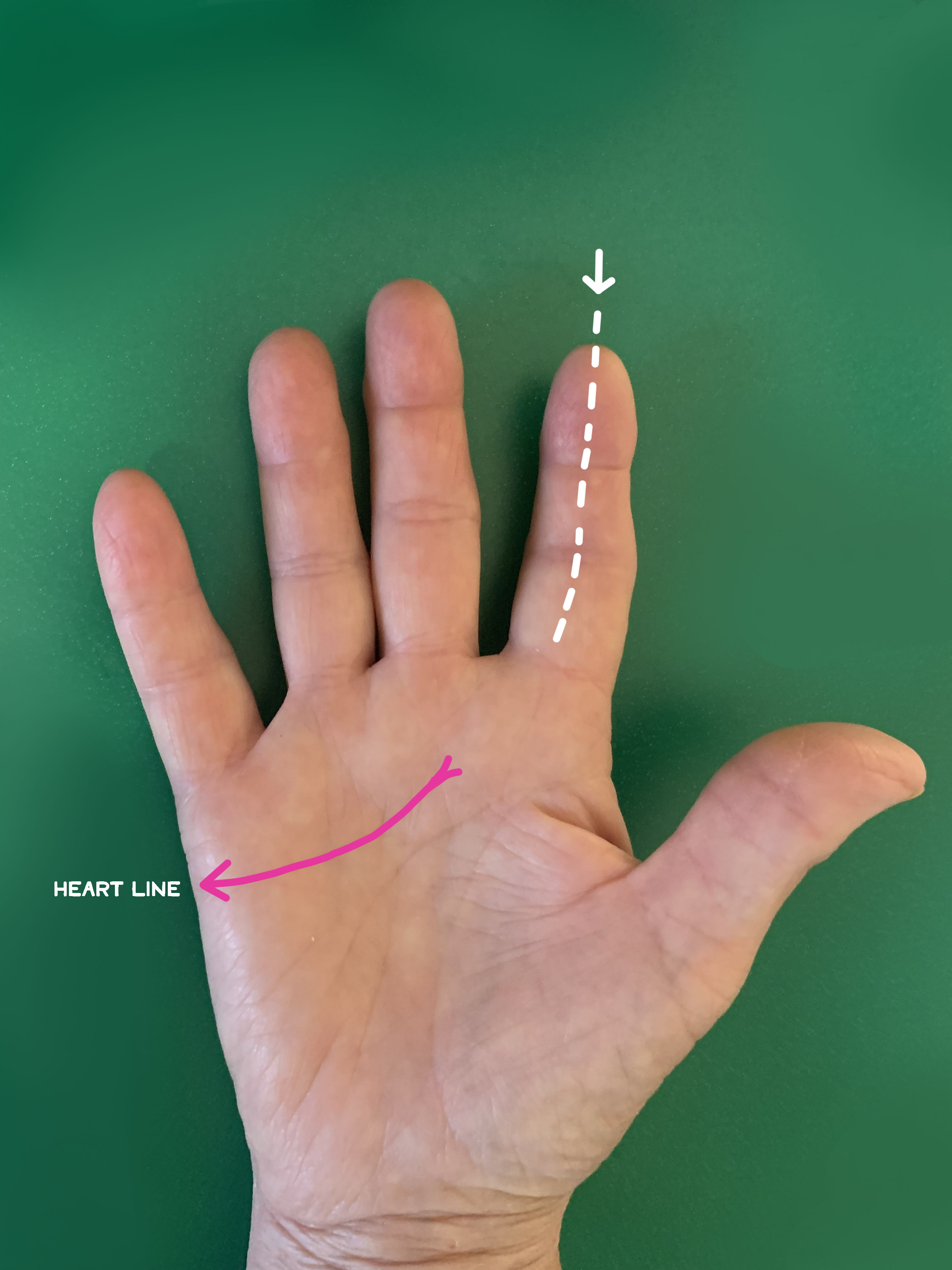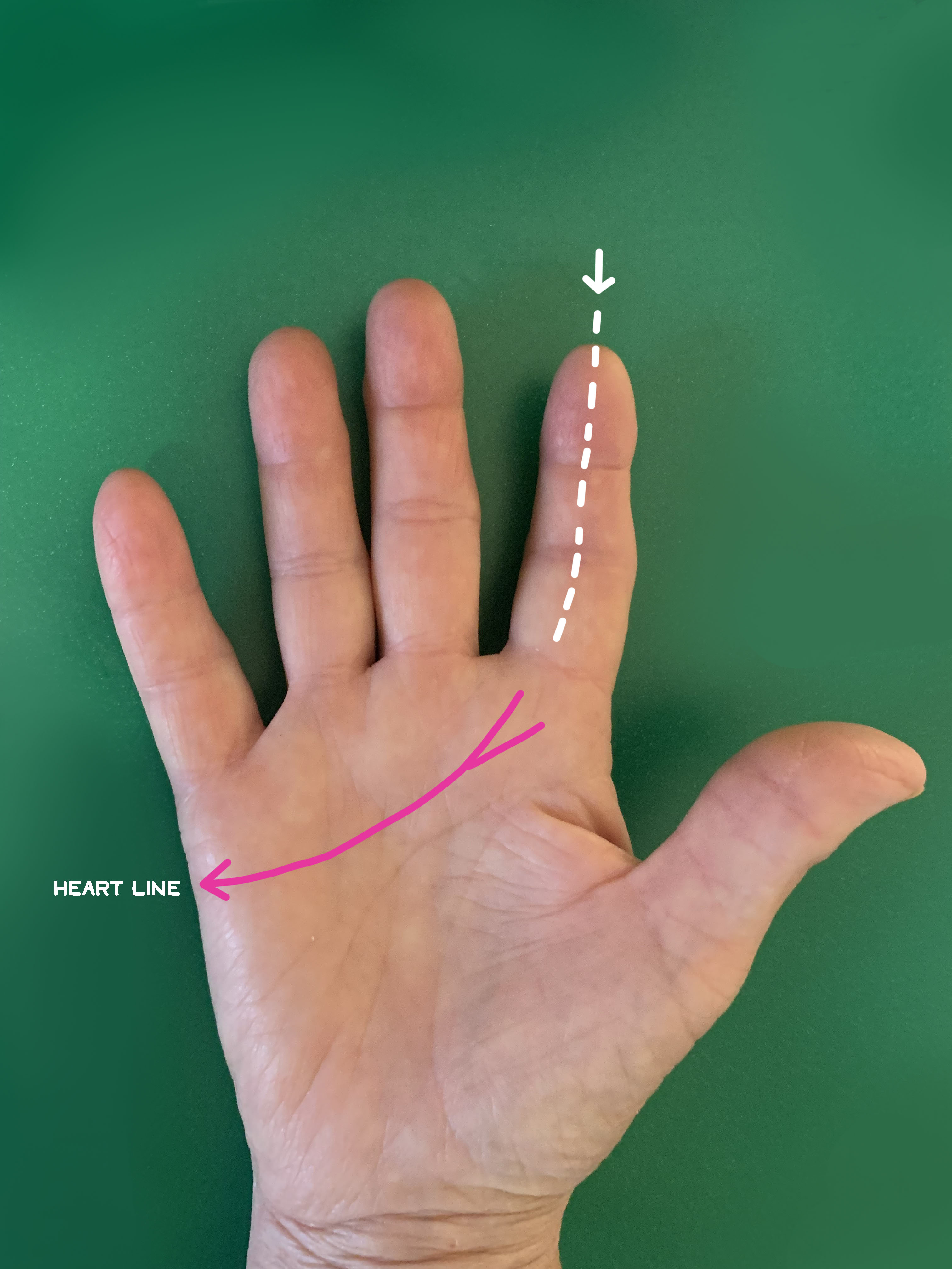 The Extended Heart Line literally extends into the Mount of Jupiter, oftentimes also curving between the middle and pointer fingers