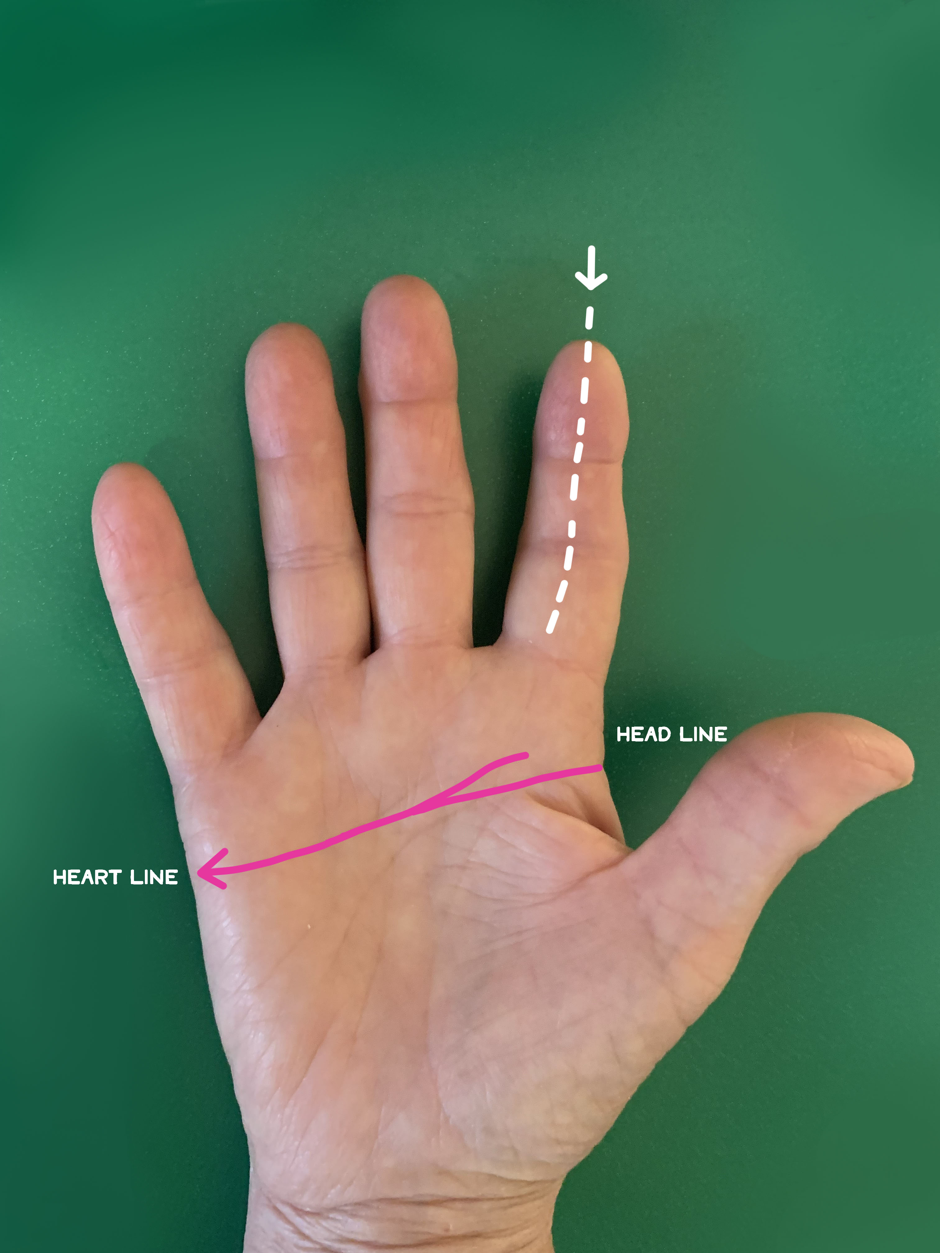 The Line of The Heart is said to represent the native’s basic emotional disposition (generous, withheld, fickle etc.) as well as important years in matters of the heart (relationships, life-path changes, etc.) based on a specific interpretation for timing.