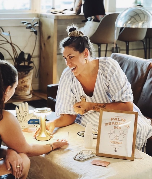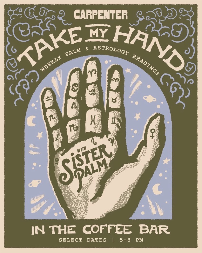 Join Sister Palm at Carpenter Hotel in Austin, TX, Third Thursdays from 5-8 PM for insightful palm readings and predictive astrology consultations.