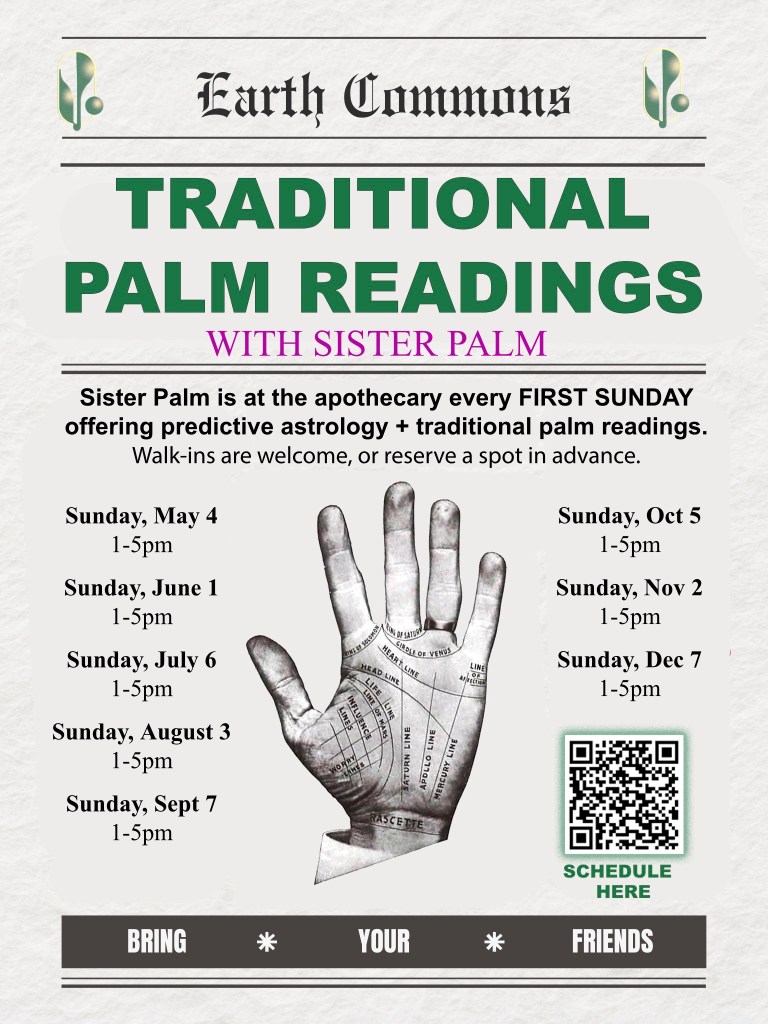 Join Sister Palm at Earth Commons Apothecary in Austin, TX, every first Sunday of the month from 1-5 PM for insightful palm readings and predictive astrology consultations.