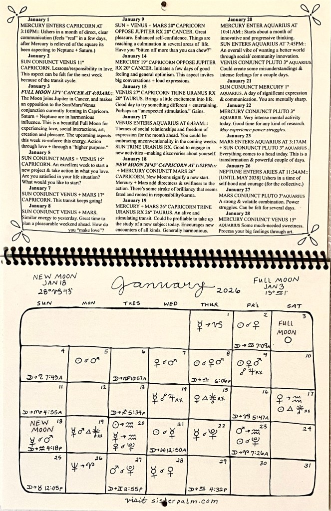 Sister Palm’s 2026 astrological calendar is a comprehensive and easy-to-use guide designed to help both beginner and advanced astrology students integrate the ever-changing cosmos into their daily lives.